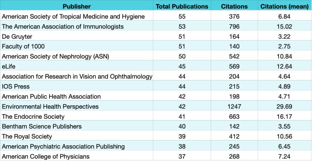 Librarians use Dimensions to answer these questions. You can easily filter content published by your researchers then match it together with contextual metrics like citation means and your readership data. Exporting the data and reviewing it in table format (figure 2) can often reveal unexpected insights. For example, in figure 2, we see a publisher with a higher than average citation mean (Environmental Health Perspectives). This is interesting because it indicates that work published with this publisher is generally highly cited.