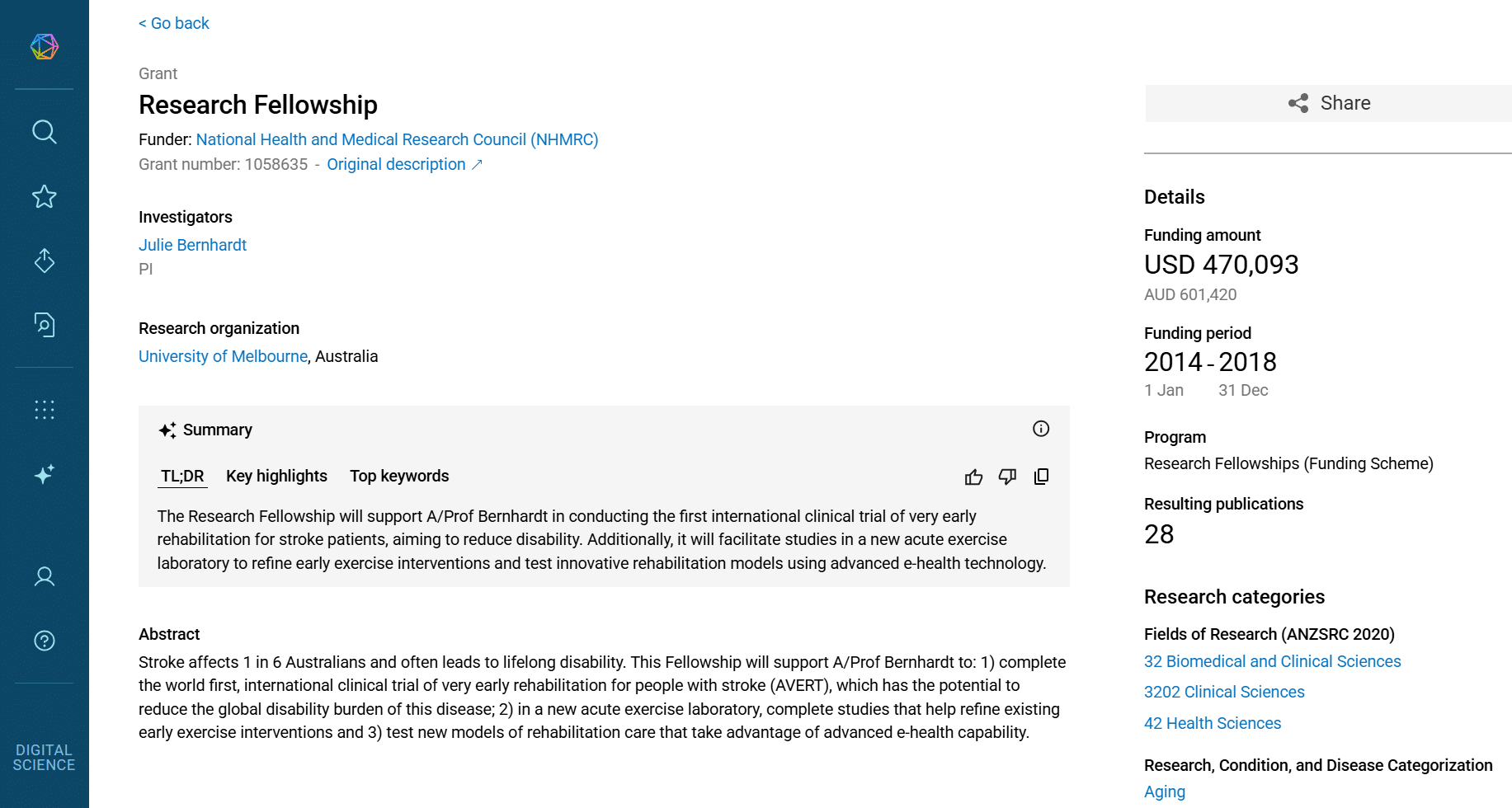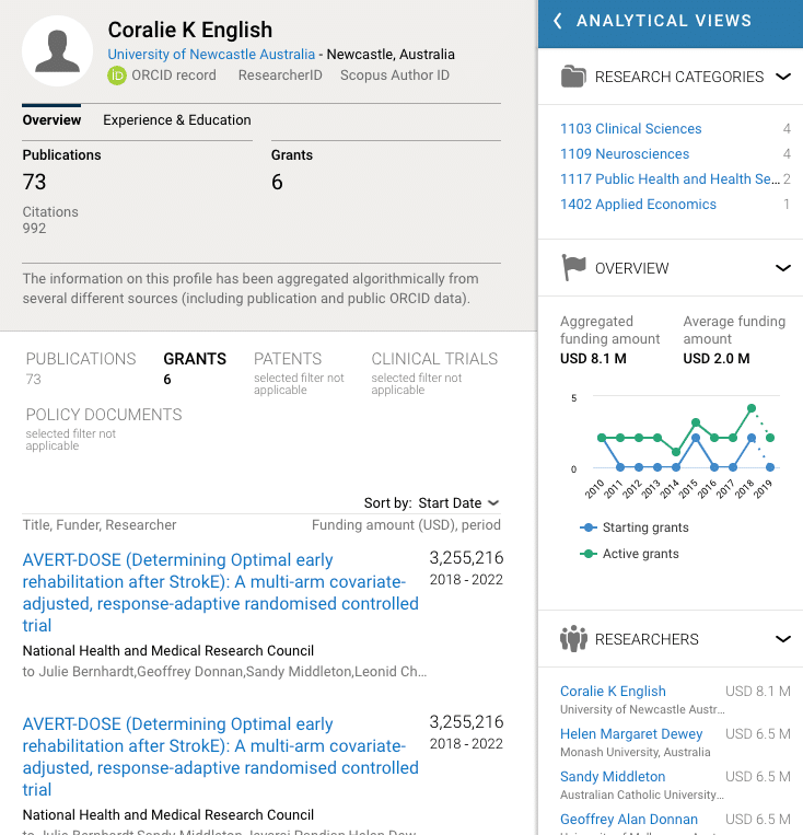 In this phase of the research cycle, Dimensions confirms that Julie Bernhardt is awarded a brand new fellowship grant which may have allowed her to concentrate more of her time on circuit-class-related research. It is the same period that more researchers are joining the research efforts, expanding the list of affiliated universities. Looking further into the grant confirms that Dr. Berhhardt has left the University of Southern Australia and is now at the University of Melbourne.