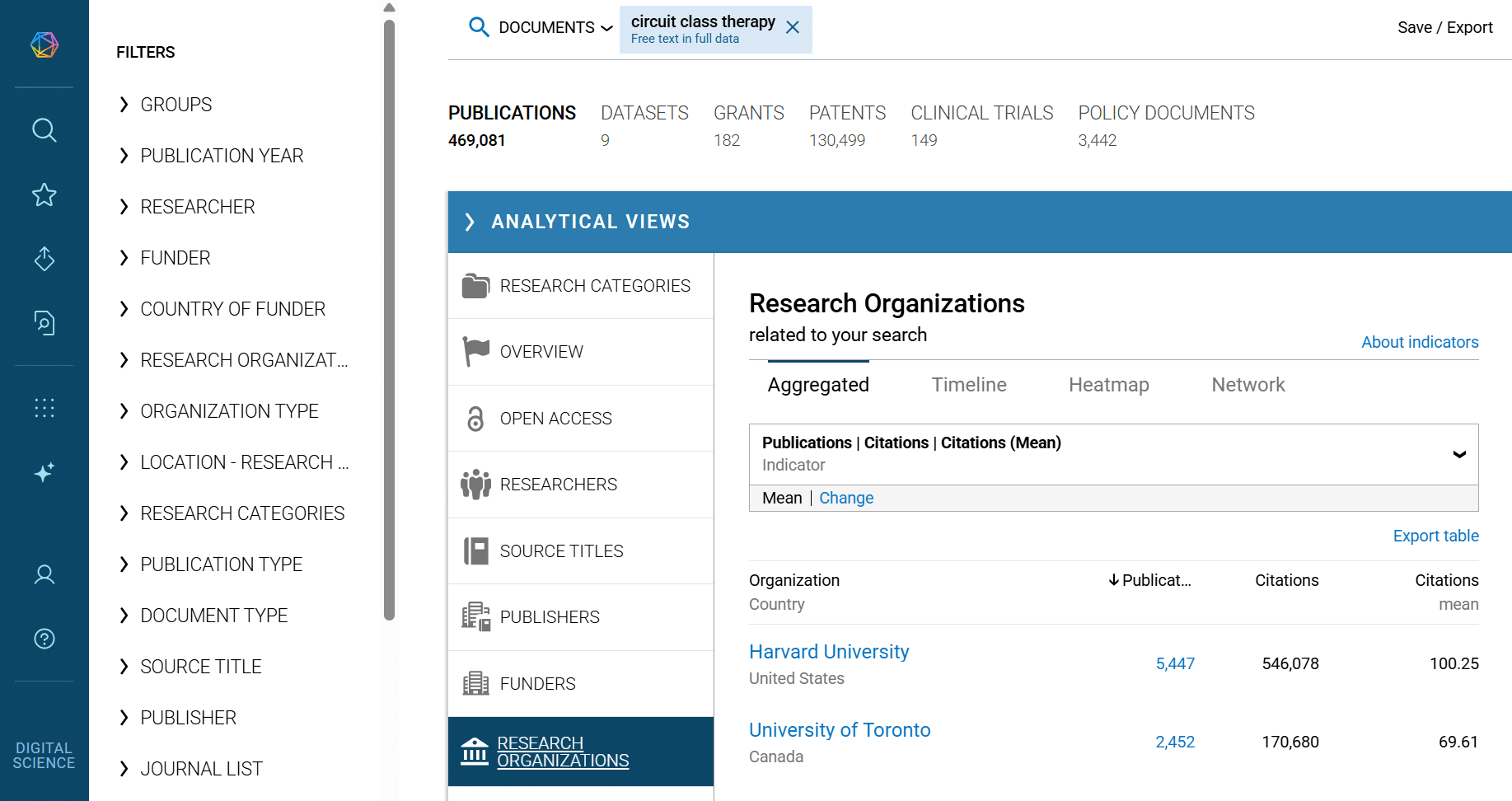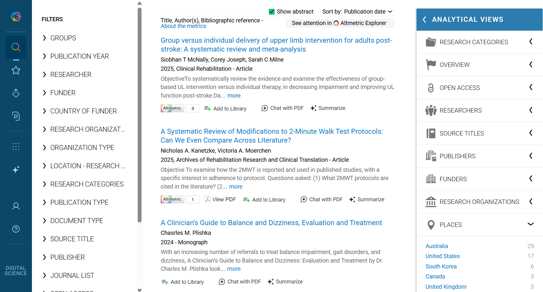 We’ll begin the search by exploring the search term ‘circuit class therapy’ within over 99 million searchable publications in Dimensions. The analytical views tab provides high-level insights and confirms that Australia as a whole has a dominant position in research about innovative post-stroke therapy with the University of South Australia in the lead.