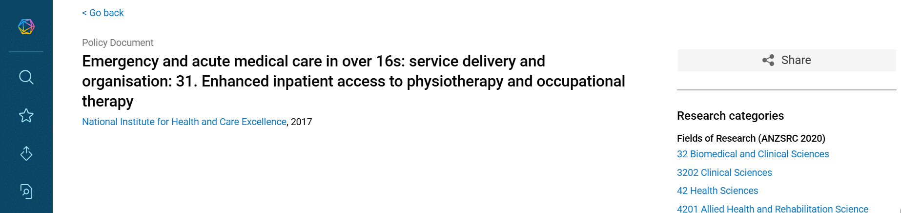 To round out the research cycle, we can explore connected policy documents to see the translation of research into policy adoption. The fact that a UK policy-making group of experts chose to cite the Australian circuit-class research shows, in a very compelling manner, the broader impact it is making internationally in stroke-rehabilitation best-practices.