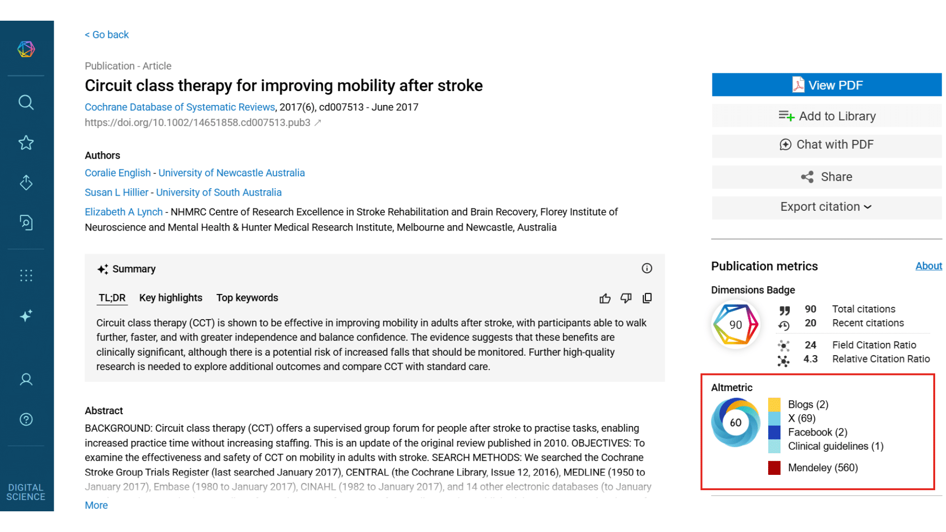 An article published in 2015 by Coralie English and her team entitled “Circuit Class Therapy or Seven-Day Week Therapy for Increasing Rehabilitation Intensity of Therapy after Stroke (CIRCIT): A Randomized Controlled Trial” is the first publication to report out on the results of the NHMRC-funded clinical trial. The Dimensions Badge indicates that the publication has a relatively high Field Citation Ratio and is extremely highly cited, receiving approximately 6.33 times more citations than average. Similarly, the Altmetric Badge confirms a high Attention Score and 37 public tweets that link directly to the publication, providing evidence of this work influencing people in the health professions.
