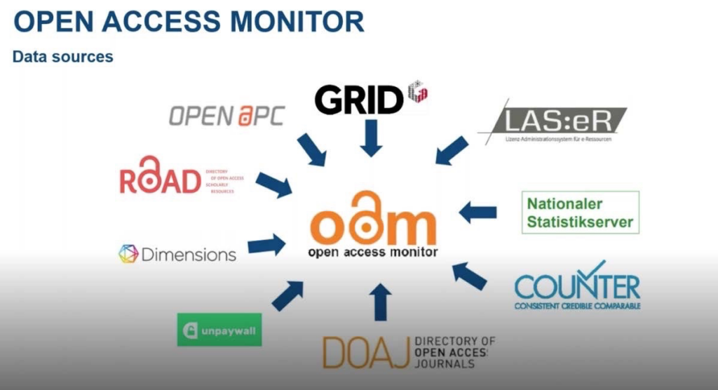 Dimensions supplies the monitor with authority files on publications, citations, publishers, and journals. While GRID provides the authority files for organizations so that outputs and authors can be correctly matched to parent institutions in Germany. All other sources used in the project (illustrated in Fig. 1) are, or will be mapped to Dimensions as the authority data set. These sources include article processing charge costs, subscription costs, counter usage statistics, and other OA metadata sources