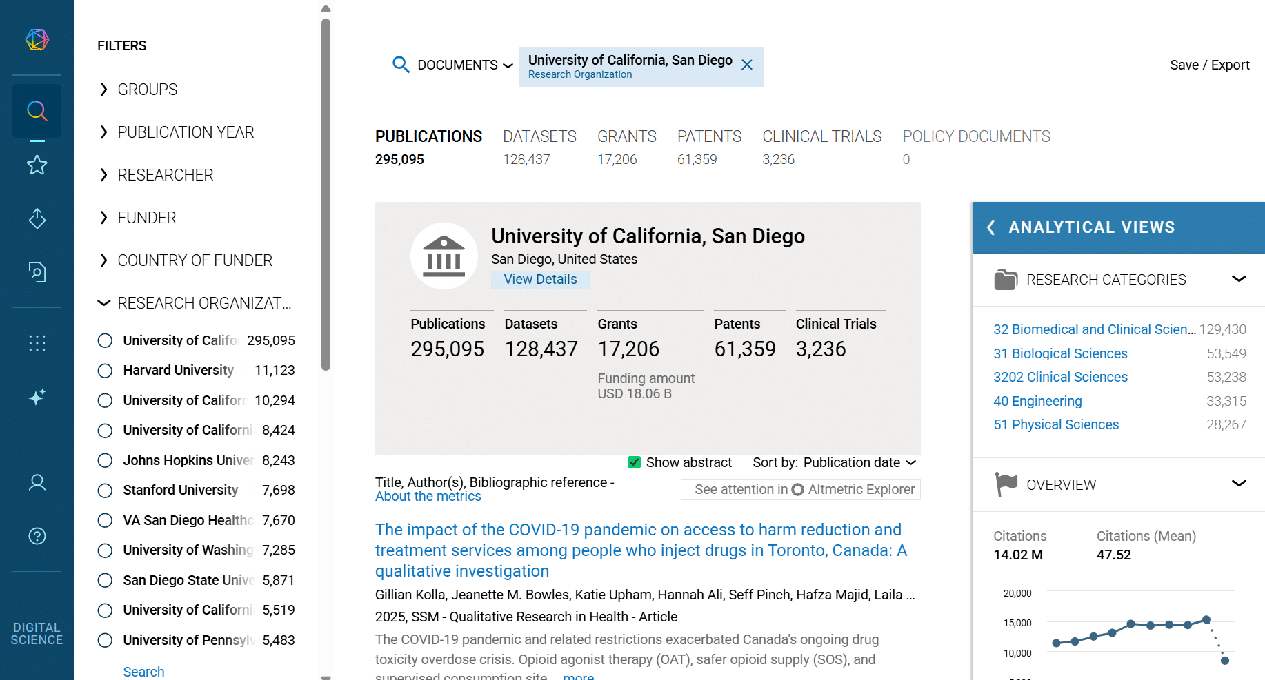 Before they invested in Dimensions, the Library was trying to understand UC San Diego’s research activity but was getting hampered by inconsistent metadata based on extractions from over 150 different institutional repositories and various publisher sources. David comments “Dimensions offered something better. The rigor and consistency in the data structure was very obvious. It was easy to write a simple or complex query and when the data results were returned, you could trust them. You could see that significant work had been done behind the scenes to make the data in Dimensions both usable and understandable.”
