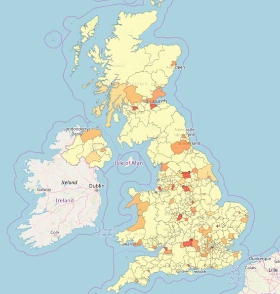 The team also created a lookup from the town/city geocode to the ONS local authority unit. The ONS has GeoJSON files for various geometries. From this, they produced the choropleth map highlighting clusters of research specialisms across the UK.