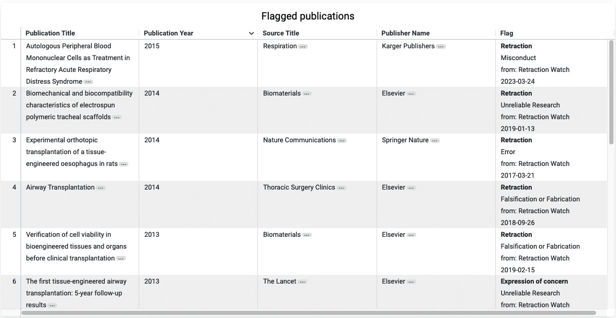 - Flagged papers: publications with updates that may be important to know about, including retracted papers, publications with expressions of concern, and papers flagged by the Problematic Paper Screener as containing known tortured phrases