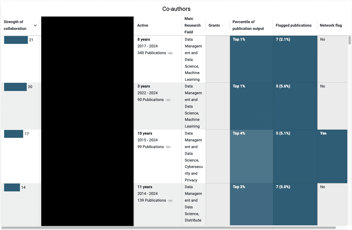 Dimensions Author Check transforms the process. In record time, you can thoroughly review the publishing history of an author, reviewer, or editor and the people they have collaborated with, to spot any unusual activities such as retractions, expressions of concern, or atypical collaboration patterns.