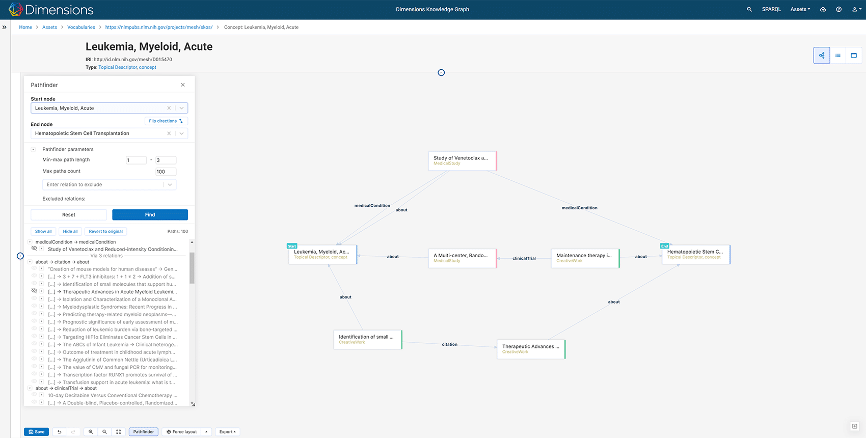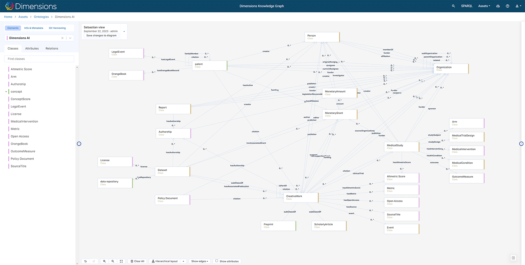 The Dimensions Knowledge Graph, powered by metaphactory, simplifies and accelerates the generation of actionable insights across the entire pharma value chain. With over 32 billion statements, it delivers a wealth of knowledge and insights derived from global research and public datasets. Its underlying semantic model gives you the tools you need to additionally connect your internal knowledge and delivers a layer of trust and explainability for AI algorithms and applications built on top of the graph.