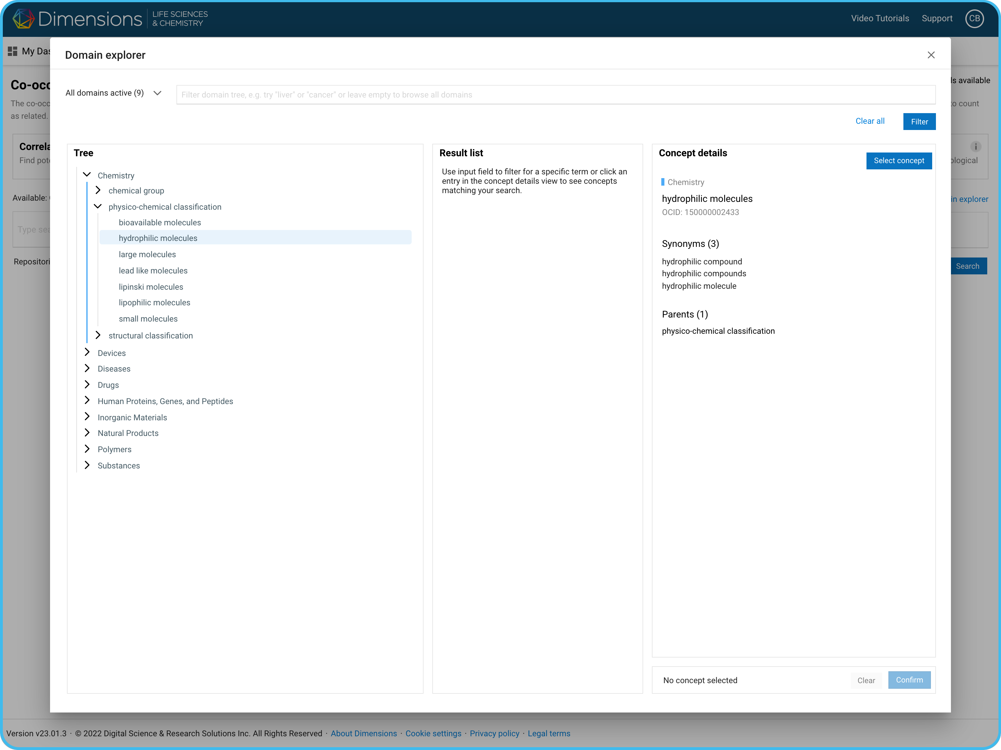 - Dimensions L&C uses the ontologies from OntoChem, which include around 40 million concepts and 100 million synonyms from more than 35 knowledge domains such as compounds, proteins, diseases, drugs, materials, methods, devices or species