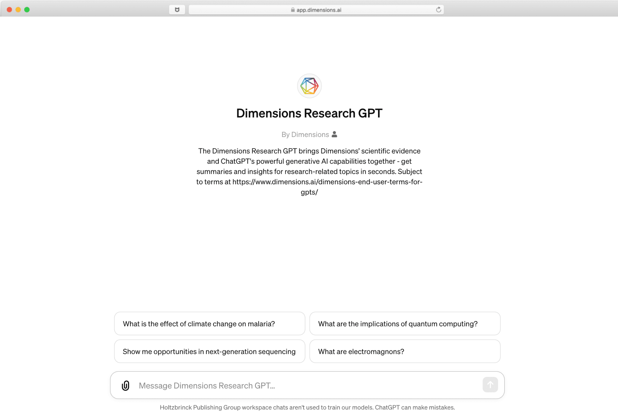 Accessible for free via OpenAI’s ChatGPT, users can ask conversational questions and receive informed answers from the Dimensions database. This enables any user to gain enhanced and new insight into research with the confidence that is grounded in scientific evidence.