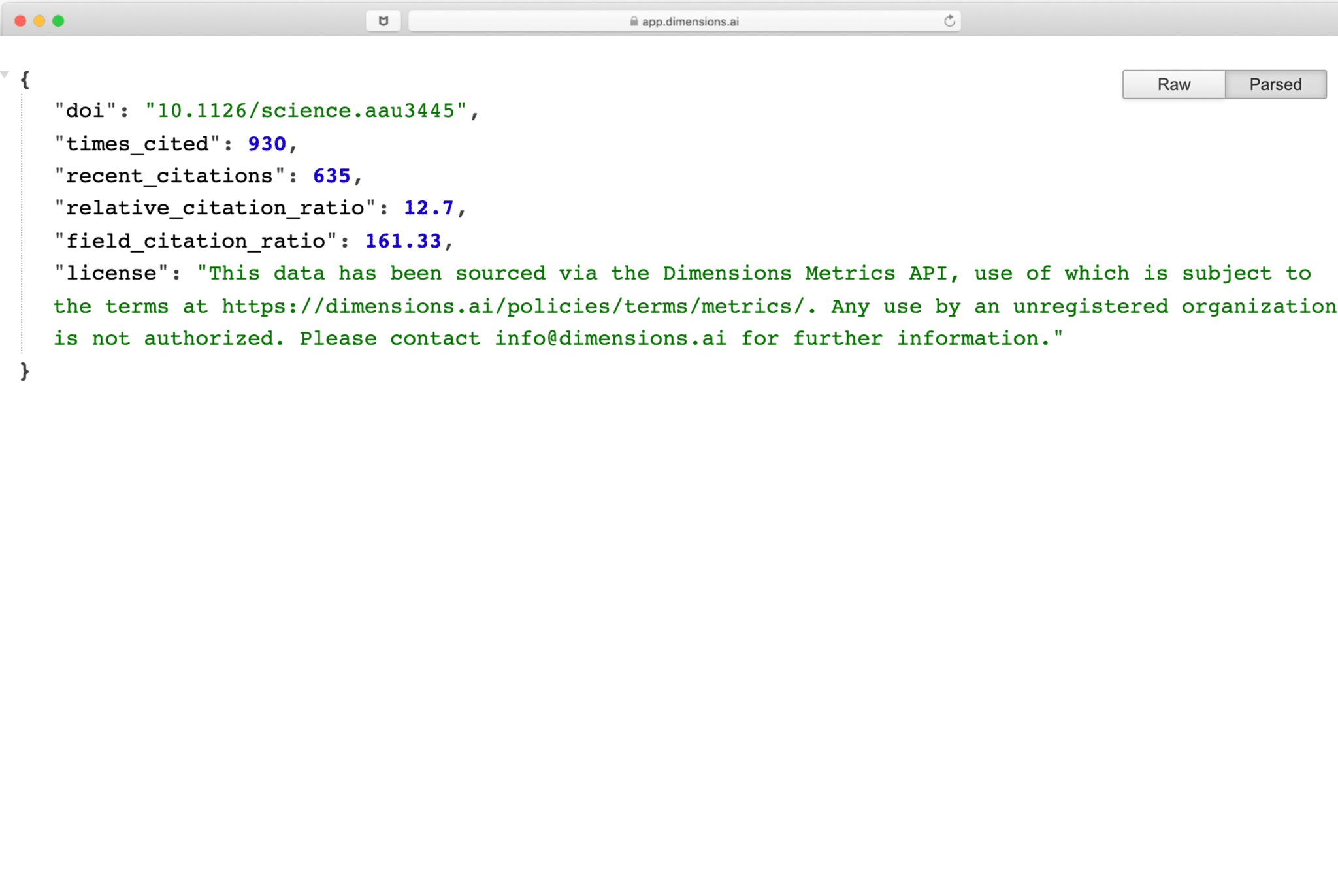 The Dimensions Metrics API provides free programmatic access to article-level indicators, including citation counts, Relative Citation Ratio (RCR), Field Citation Ration (FCR) and recent citations.