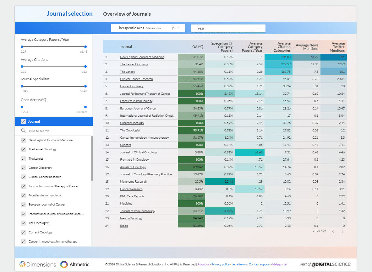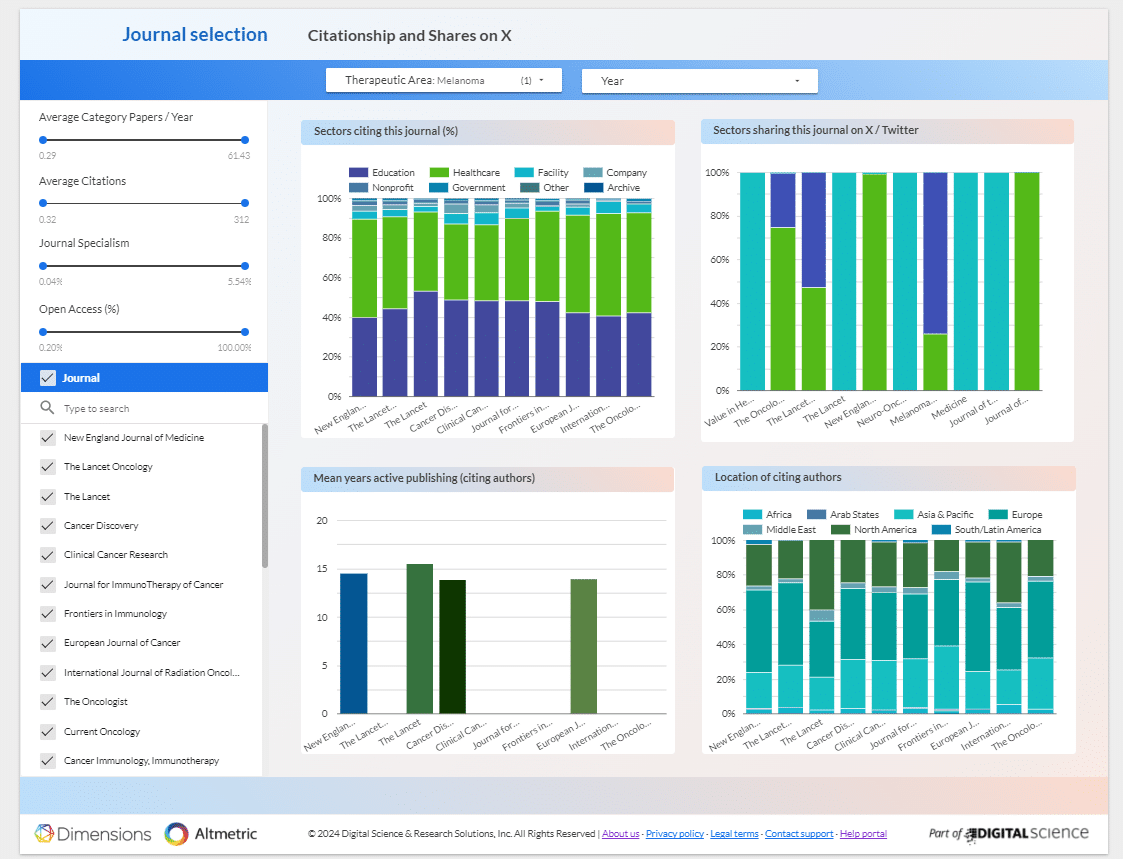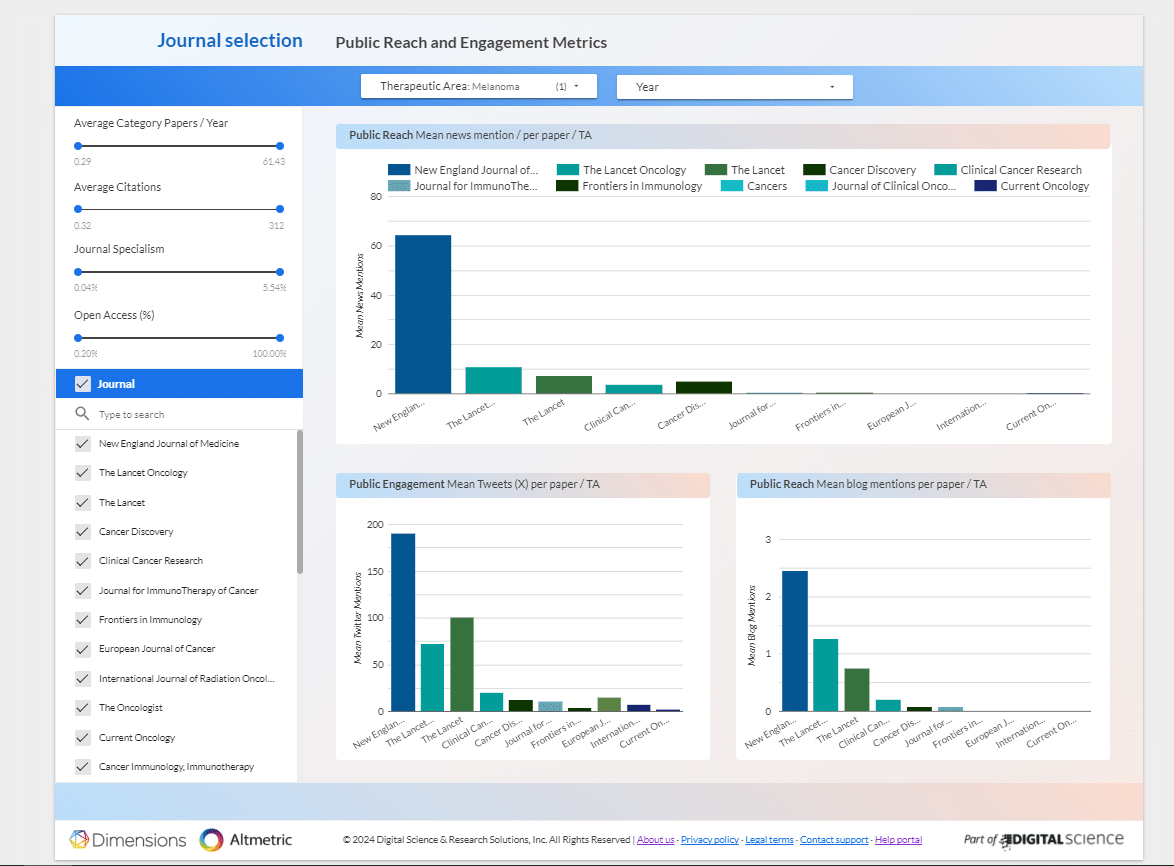 The Journal Selection dashboard makes it quick and easy thanks to a combination of Dimensions and Altmetric data. It gives publication planners access to the full picture with both traditional and alternative metrics, showcasing online and social impact and helping you reach the right healthcare professionals.