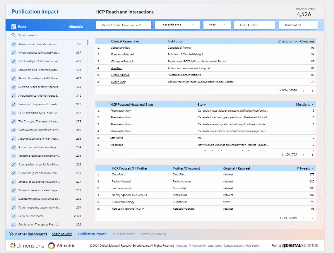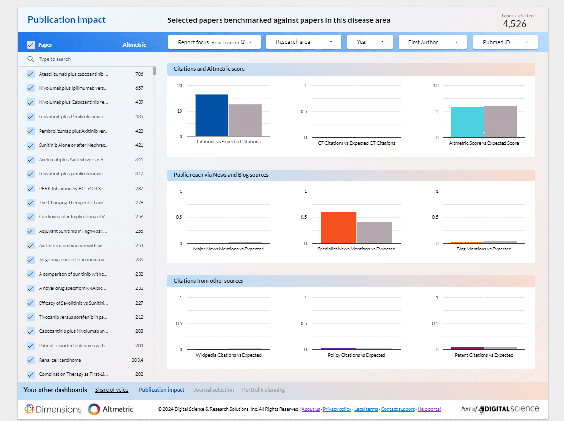 Access insights relevant to your therapeutic area to easily track, monitor and share the success of your publications in one visual and easy-to-use dashboard. Whether you’re focusing on a specific drug, disease area or intervention, the dashboard provides critical insights that align with your research goals. This information empowers you to stay ahead of emerging trends and adapt your strategy accordingly.