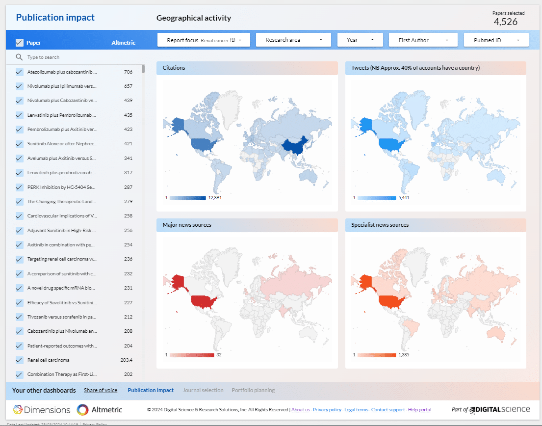 - Find out which publications received the most engagement and where it came from. Visualize the geographical spread of attention and identify key influencers amplifying your research.