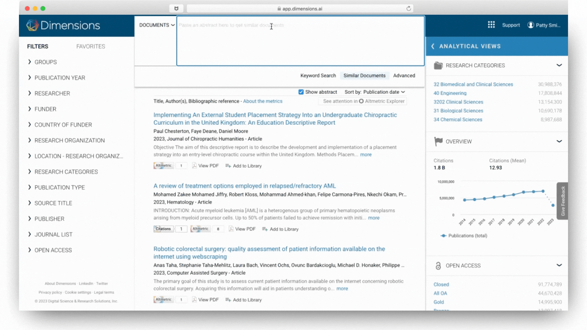 With more interconnected data than any other provider and smart functionality to fast-track interpretation, Dimensions lets you find what you need fast, evaluate it easily, and make confident decisions to achieve your strategic goals.